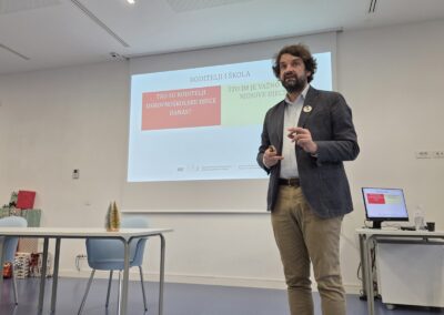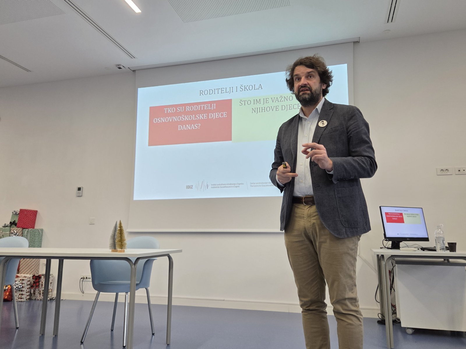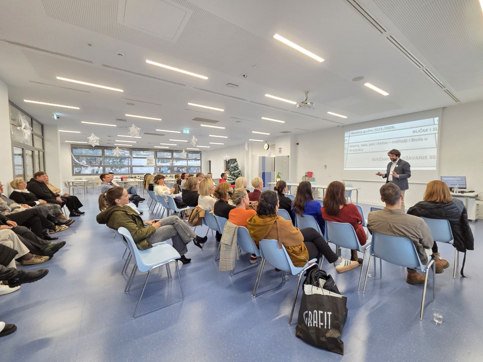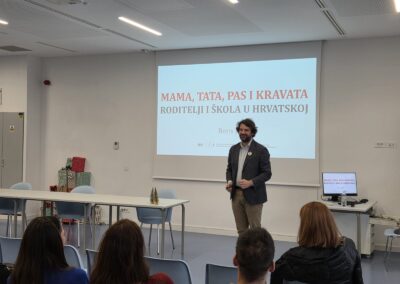 U četvrtak 11. prosinca u Školi je predavanje naziva „Mama, tata, pas i kravata: odnos roditelja i škole u Hrvatskoj danas“ održao naš poznati psiholog i znanstvenik dr. sc. Boris Jokić iz Instituta za društvena istraživanja u Zagrebu. Usavršavanje je provedeno u organizaciji ravnatelja Ivana Žagara kao oblik edukacije usmjeren na izazove s kojima se nastavnici svakodnevno susreću. Na iznimno zanimljiv i interaktivan način, uz činjenice i glazbu, razgovaralo se o odnosu roditelja i škole, očekivanjima u odnosu roditelj – škola – učenik, o obrazovanju, uvažavanju i povjerenju. Zahvaljujemo našem predavaču i pozivamo ga na ponovni posjet našoj školi.