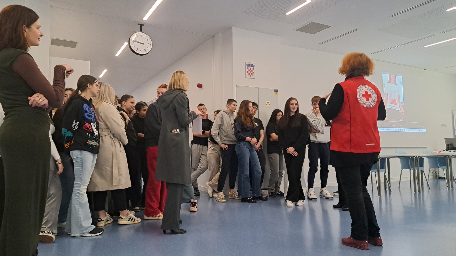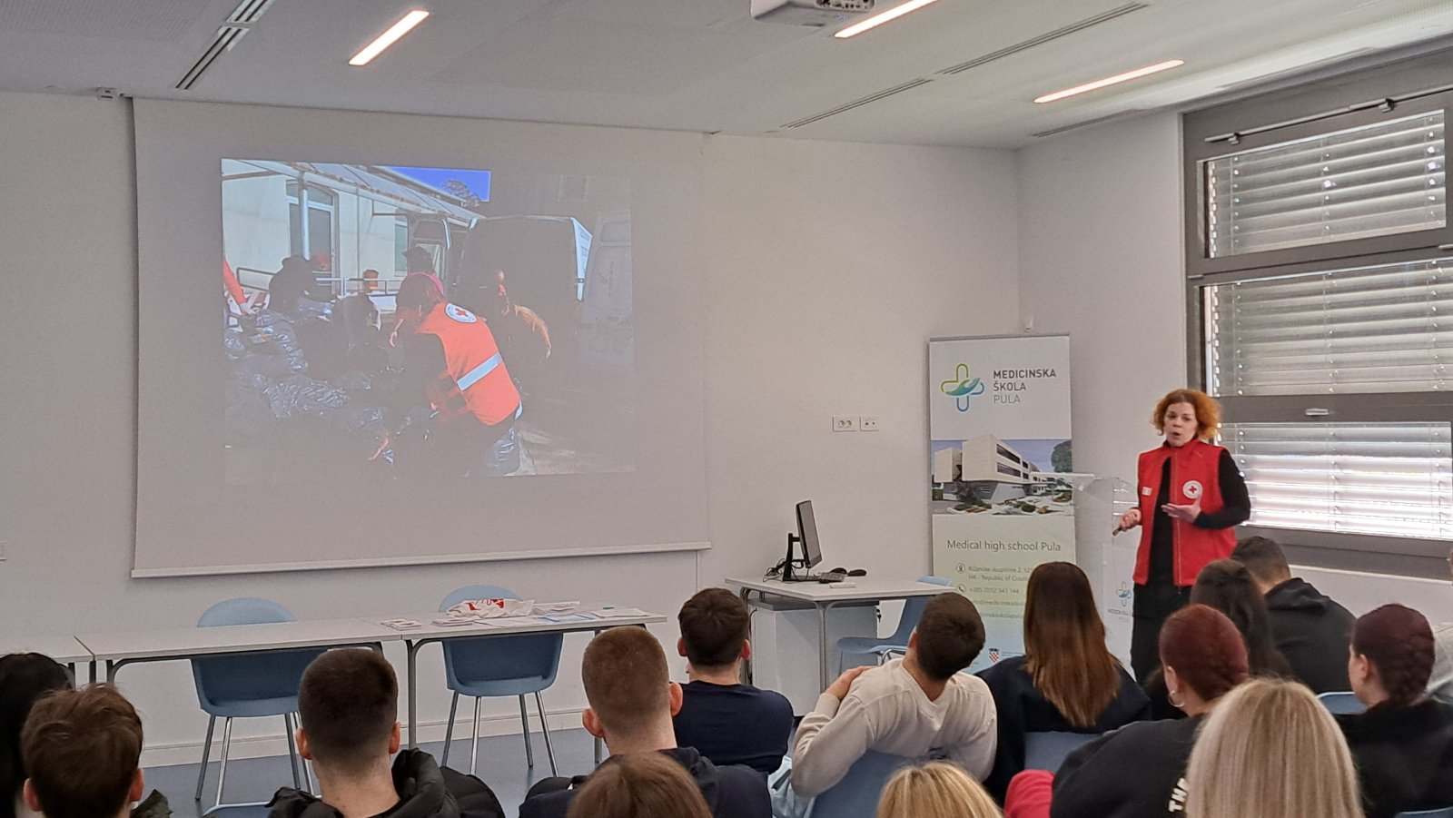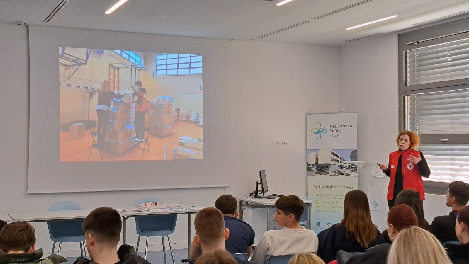 U školi je 18. veljače gostovala Jelena Rupčić, voditeljica mladeži, službe traženja i socijalnog programa u Gradskom društvu Crvenog križa Pula. Predavanje je bilo namijenjeno učenicima trećih i četvrtih razreda. Uz brojne fotografije Jelena je učenike upoznala sa širokim poljem djelovanja i aktivnosti koje se provode u Crvenom križu. Kroz cijelo predavanje isticala se važnost volonterskog rada i dobrobiti koju volontiranje donosi osobama kojima se pomaže, ali i samim volonterima. Za kraj predavanja izvedena je mala vježba odabira stavova „slažem se, možda, ne slažem se“ tako da su učenici na određenu tvrdnju odabrali i argumentirali svoj izbor. Predavanje su organizirale strukovne nastavnice Karmen Mušković i Nada Burić.