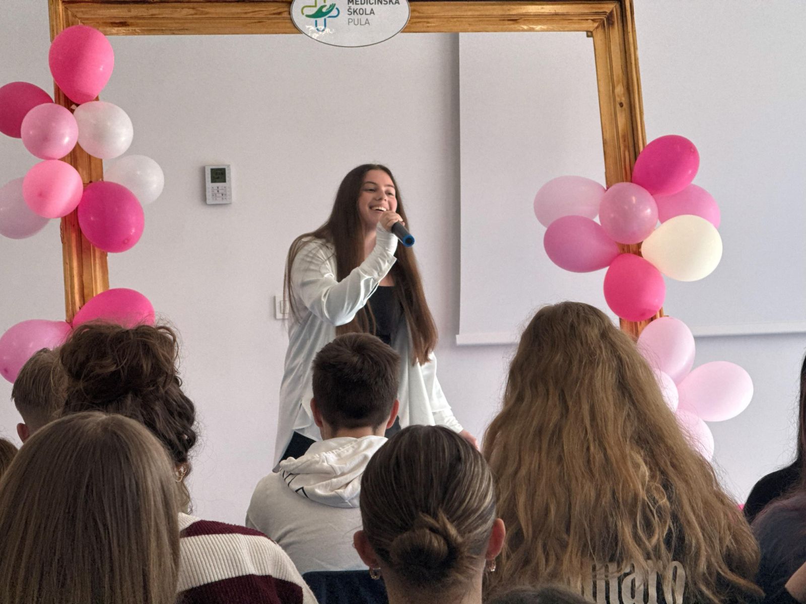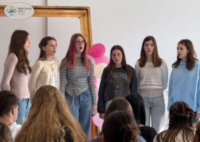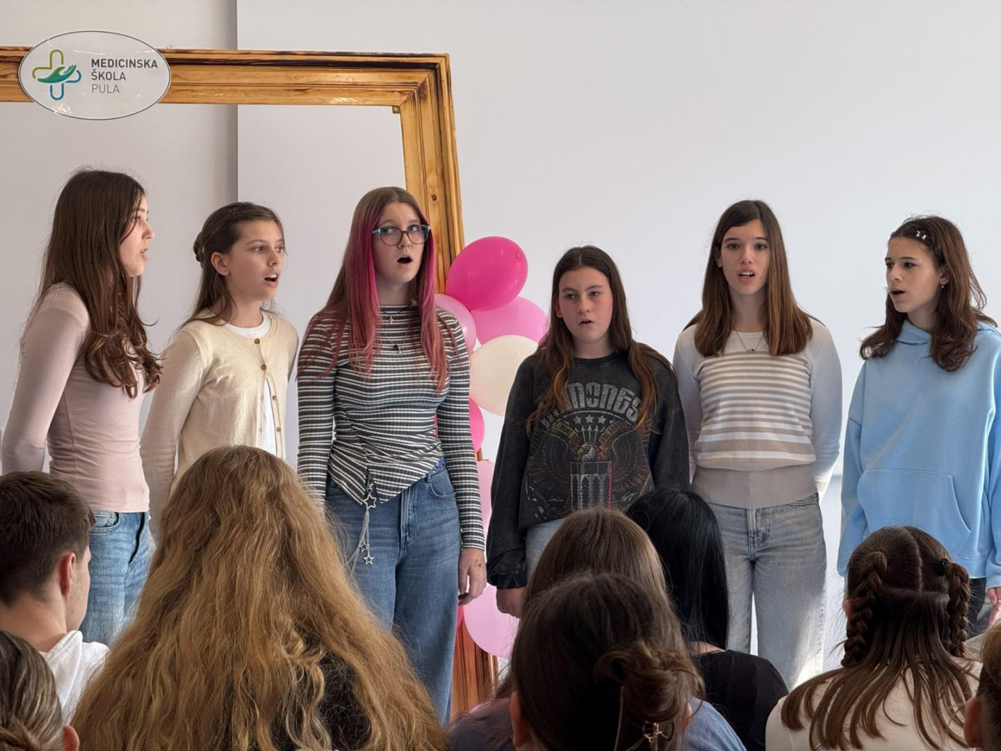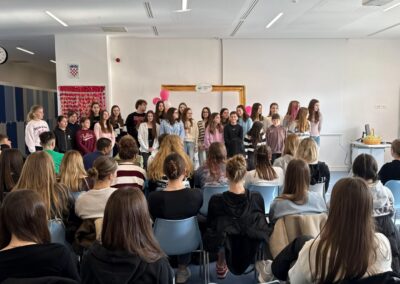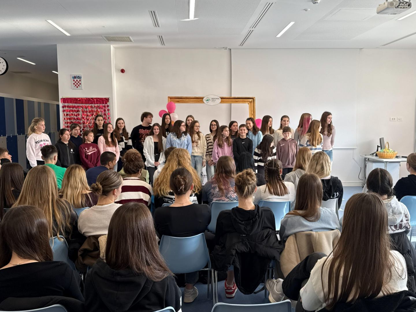 Za kraj tjedna, a ususret Valentinovu, u petak 13. veljače u školi smo ugostili klapu i zbor OŠ Kaštanjer s voditeljicom Tatianom Giorgi. Zbor se predstavio s tri, a klapa s dvije skladbe učenicima naše škole koji su ih nagradili pljeskom. Voditeljica zbora Tatina Giorgi profesorica je glazbene kulture u OŠ Kaštanjer, ali je javnosti poznat i njezin glazbeno-edukativni rad je osnivačica Studija glazbene kreativnosti „Čarobna frula“. Kako nam je sama rekla, u ovih 21 godinu kroz Studio je prošlo preko 1000 polaznika. Među njima ima i učenika naše škole, ali i nastavnika. Za kraj programa nastupila je naša učenica Simona, također polaznica Čarobne frule s pjesmom „Neka mi ne svane“.